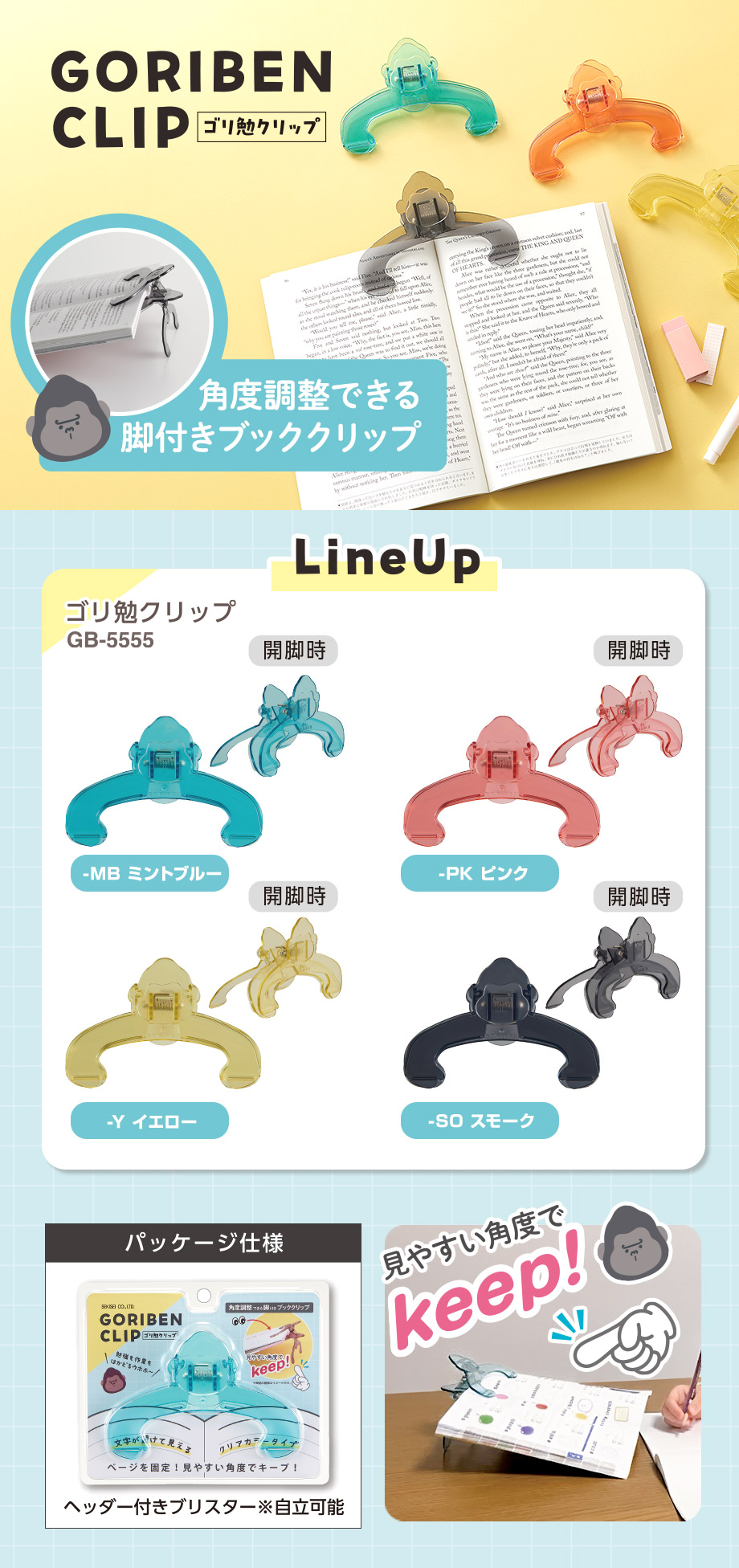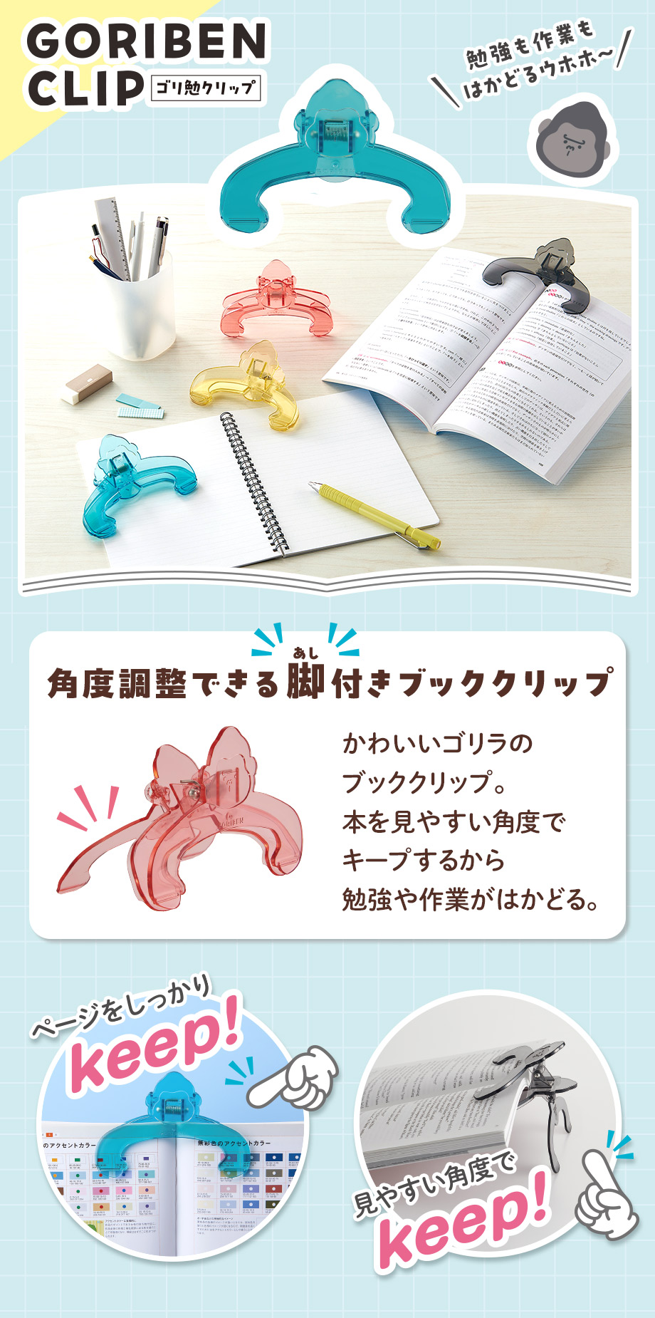 角度調整できる脚付きブッククリップ、ゴリ勉クリップ【GORIBEN CLIP】で勉強も作業もはかどる!