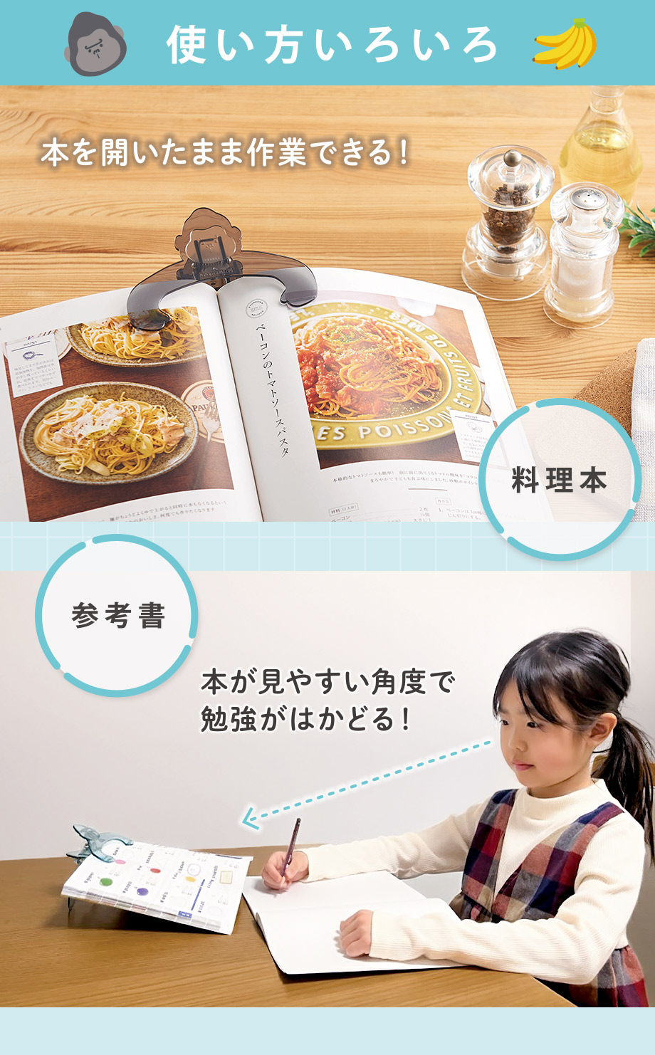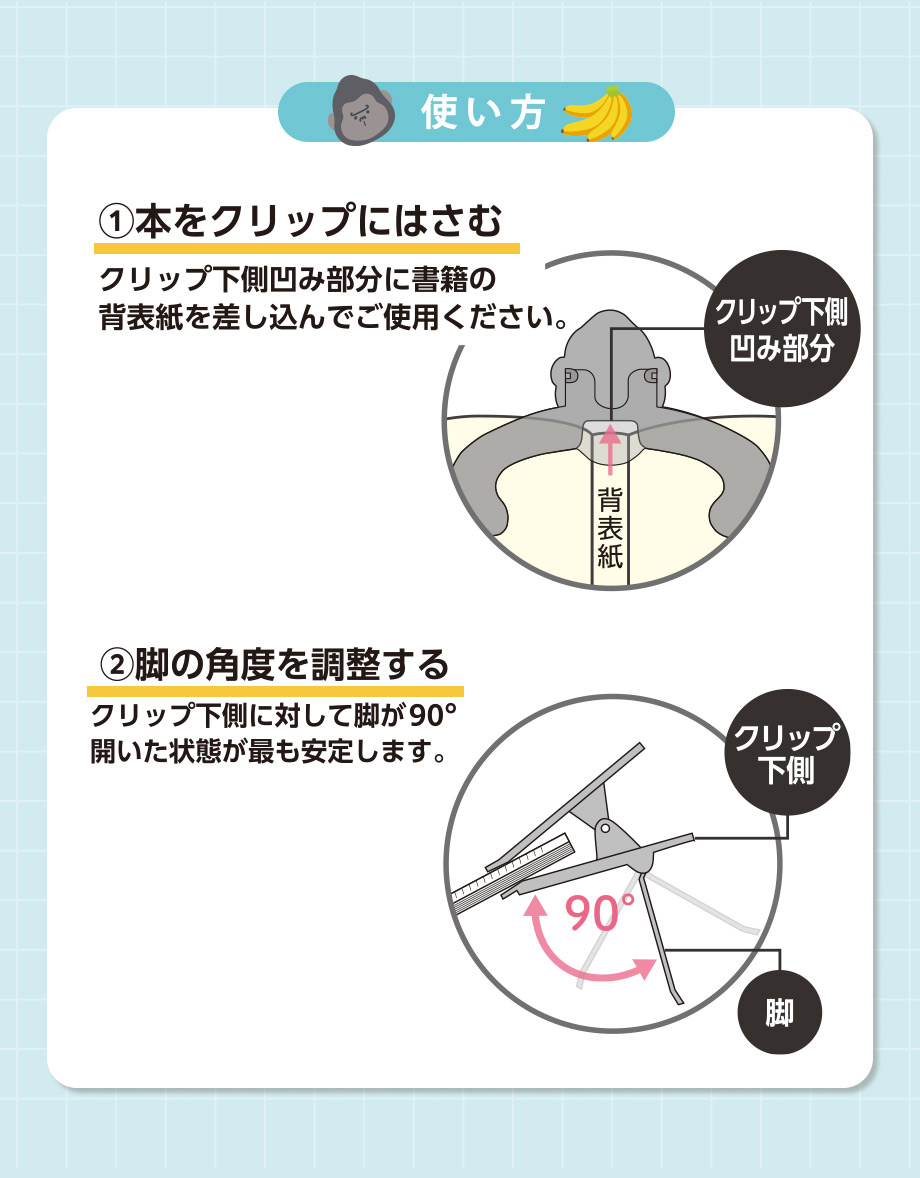 本を見やすい角度でキープできるかわいいゴリラのブッククリップです。