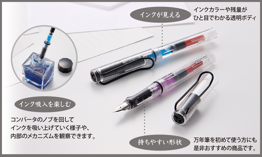 ●コンバータのノブを回してインクを吸い上げていく様子や、内部のメカニズムを観察できるのでインク吸入を楽しめます。